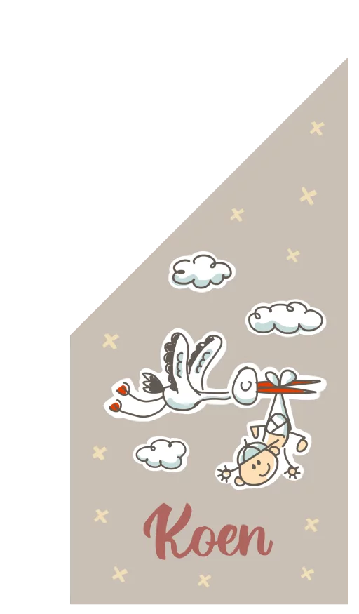 Laat iedereen weten dat jullie kindje geboren is met deze hippe geboortevlag. Op de vlag zie je een ooievaar met jouw zoontje vliegen tussen de wolkjes. Onderaan de vlag lees je de naam van het kindje. Pas de vlag naar wens aan in onze online opmaaktool.