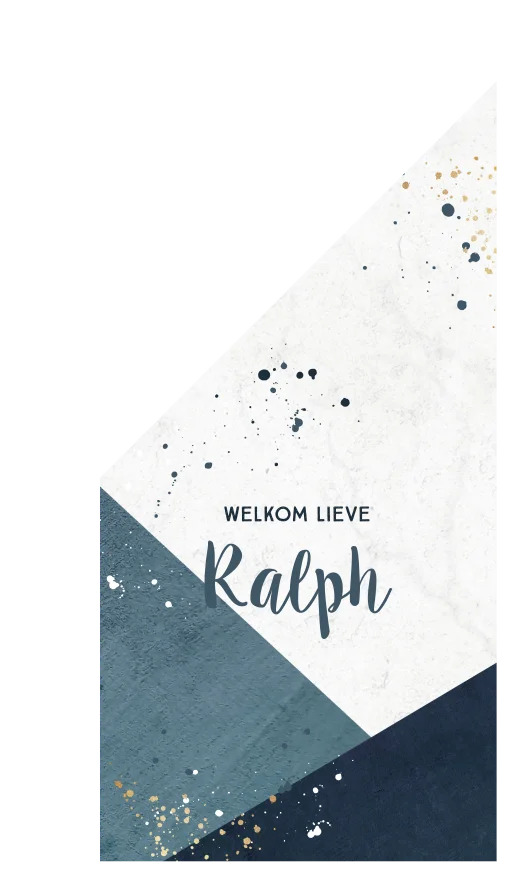 Stoere geboortevlag met geometrische vlakken in donkerblauw en wit. Rondom de naam zijn spetters in goud, blauw en wit te vinden. Pas de vlag naar wens aan in onze opmaaktool.