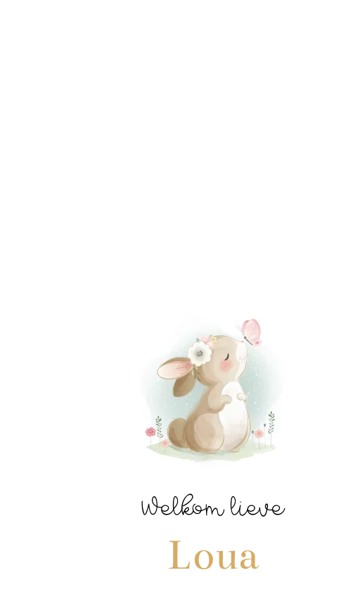 Een lieve geboortevlag voor jouw kindje. Deze vlag heeft een witte basis met daarop een konijntje, vlindertje en bloemetjes. Pas het ontwerp naar wens aan in onze online editor.