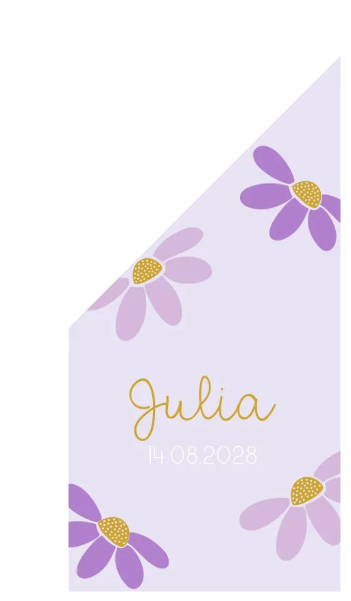 Je kleintje is geboren en dat mag de hele buurt weten! Deze geboortevlag heeft een lila kleurige achtergrond met de illustraties van bloemen in paars tinten. De vlag kan helemaal naar wens aangepast worden in onze online editor.