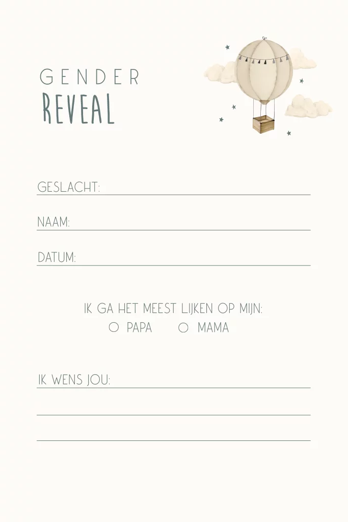 Voorspel samen met je familie en vrienden welk geslacht het is met onze invulkaarten. Deze kaarten zijn zelf te bewerken en in te vullen op de gender reveal. Het kaartje heeft een witte basis met daarop een lieve illustratie van een luchtballon. Heb je de bijpassende producten al gezien?