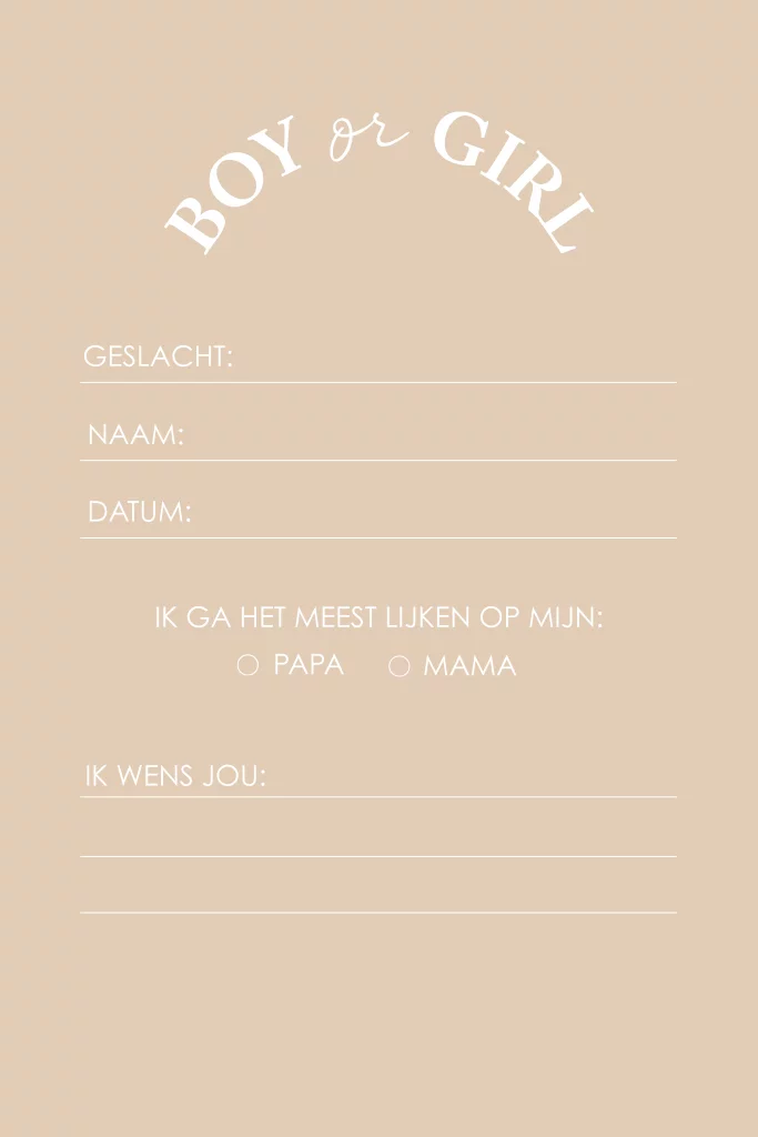 Voorspel samen met je familie en vrienden welk geslacht het is met onze invulkaarten. Deze kaarten zijn zelf te bewerken en in te vullen op de gender reveal. Het kaartje heeft een beige achtergrond met daarop de tekst 'boy or girl'. Heb je de bijpassende producten al gezien?