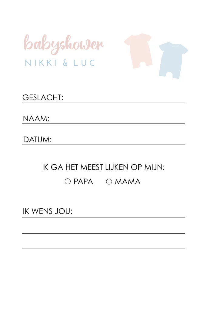 Voorspel samen met je familie en vrienden welk geslacht het is met onze invulkaarten. Deze kaarten zijn zelf te bewerken en in te vullen op de gender reveal. Het kaartje heeft een witte basis met daarop een lieve roze en blauwe rompertjes. Heb je de bijpassende producten al gezien?