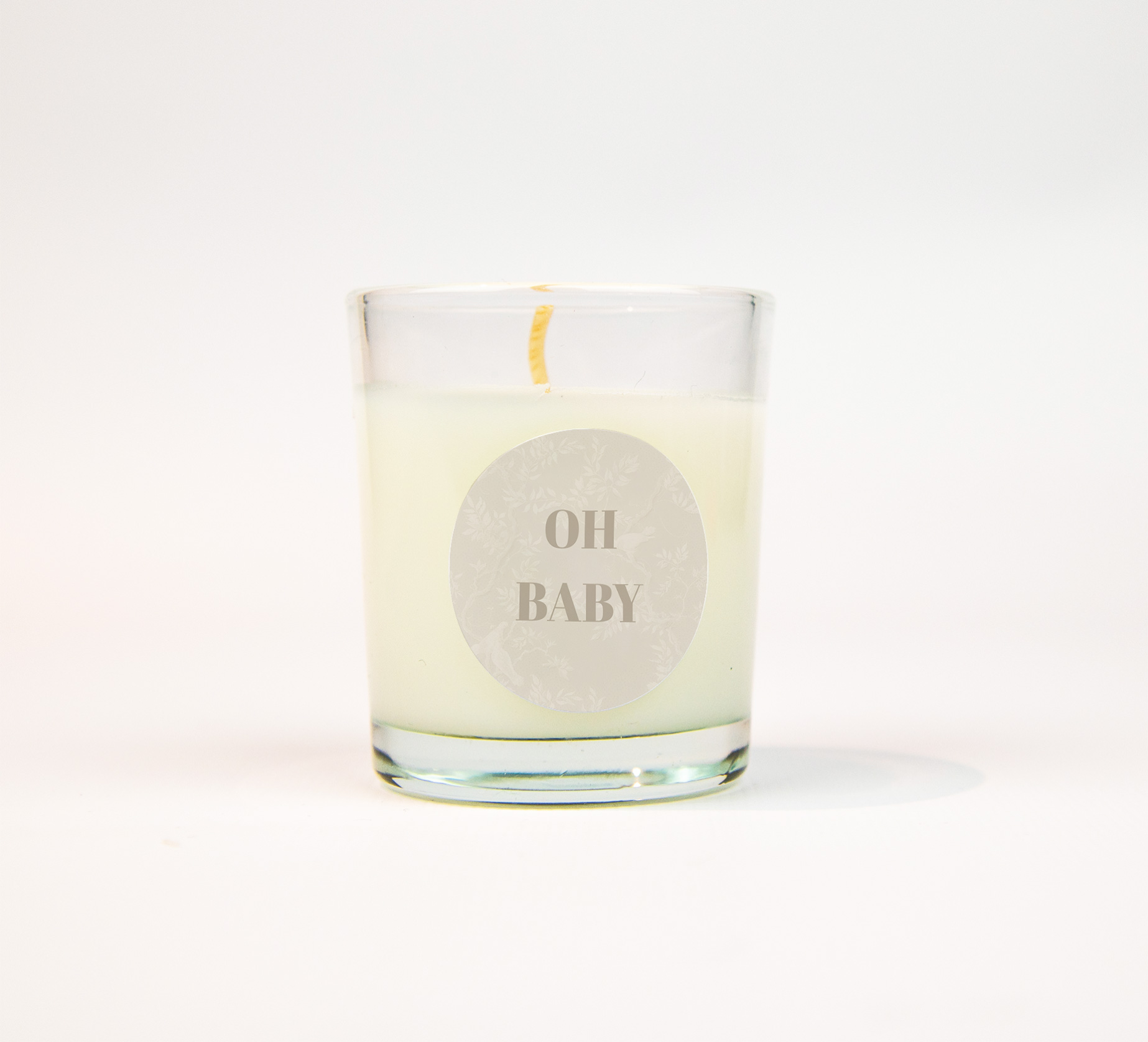 Een lieve sticker met beige stoflook en de tekst 'oh baby'. De sticker is ideaal voor op bedankjes of als versiering. Pas het ontwerp naar wens aan in onze online editor.