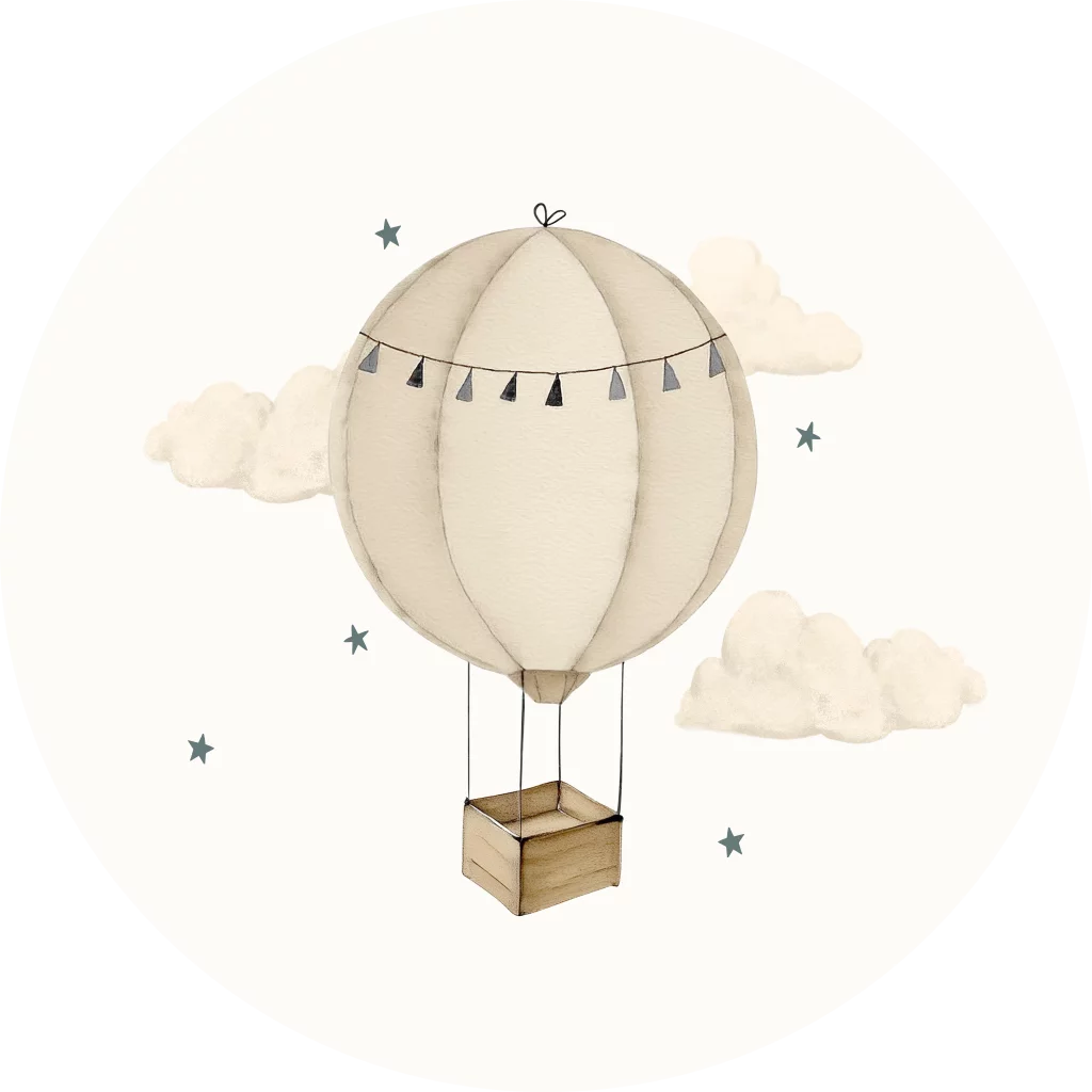 Toffe sticker met beige achtergrond en een lieve luchtballon. De sticker is ideaal voor op bedankjes en als versiering. Pas het ontwerp naar wens aan in onze online editor.