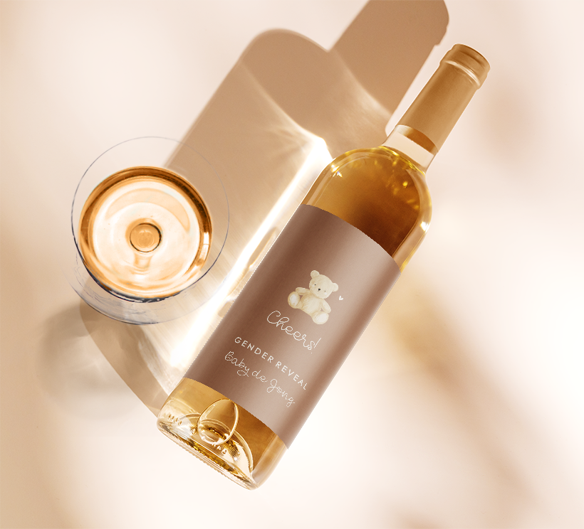 Maak de gender reveal compleet met bijpassende wijnetiketten. Leuk als bedankje of voor op de wijnflessen op tafel. Het etiket heeft een bruine achtergrond met daarop lieve illustratie van een teddybeer. Het etiket kan helemaal naar wens aangepast worden in onze online editor. Op één vel staan 5 wijnetiketten.