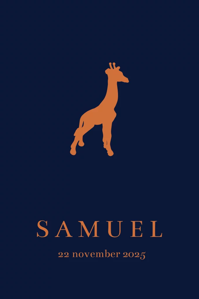 Dit is een prachtig minimalistisch kaartje voor de geboorte van jullie zoontje. De giraffe en typografie in koperkleur komen mooi naar voren tegen de donkerblauwe achtergrond. Pas het kaartje naar wens aan in de online editor.