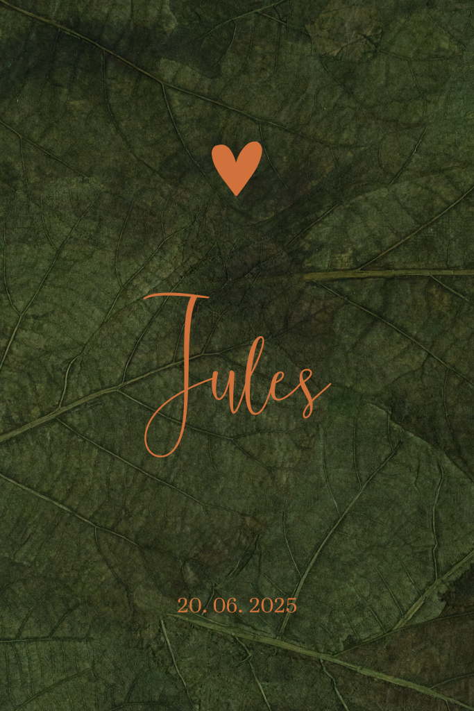 Dit is een stoer kaartje voor jullie pasgeboren zoontje. De groene bladeren op de achtergrond passen mooi bij de typografie en het hartje in koperkleur. Bestel snel een proefdruk om dit kaartje in het echt te bewonderen!