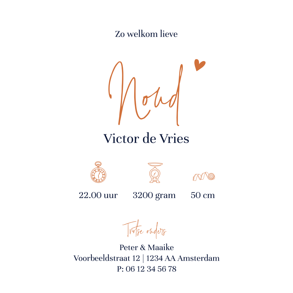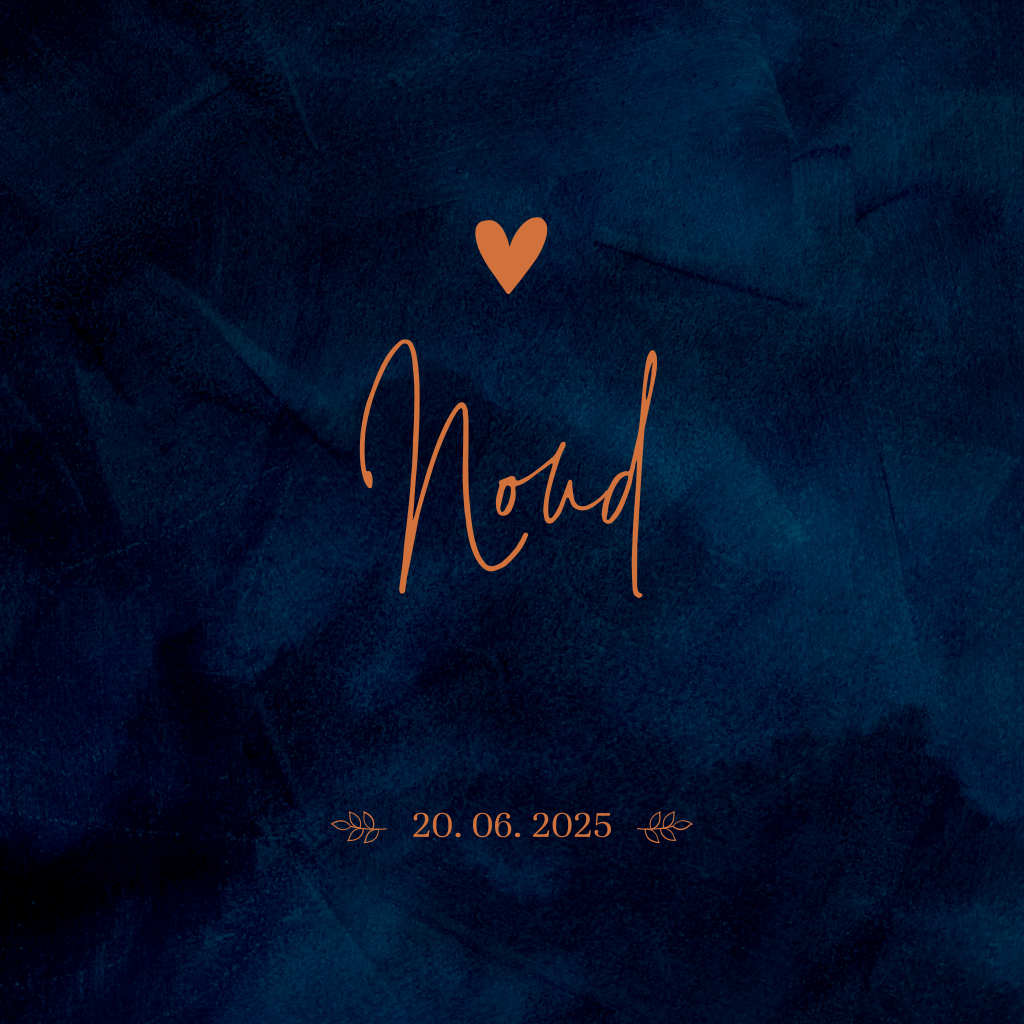 Dit is een minimalistisch kaartje voor jullie pasgeboren zoontje. Het koperkleurige hartje en de typografie komen prachtig naar voren tegen de blauwe velvet-look achtergrond. Bestel snel een proefdruk om dit kaartje in het echt te zien!