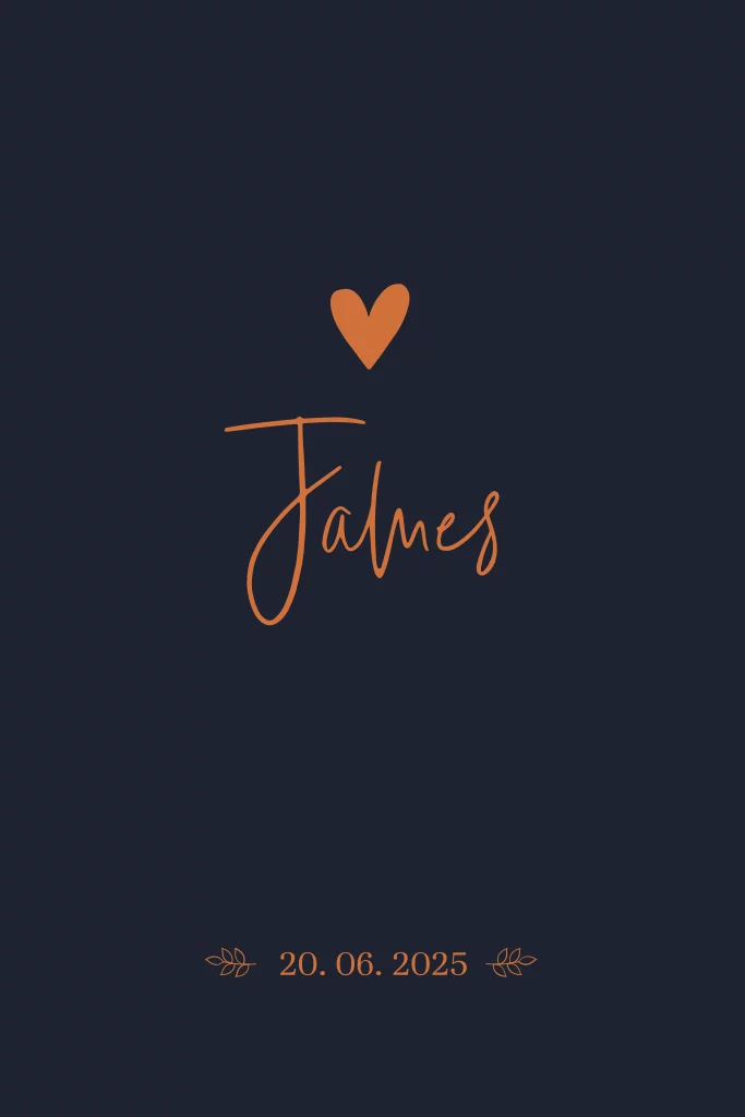Dit is een lief kaartje voor de geboorte van jullie zoontje. De koperen naam, geboortedatum en het hartje zorgen voor een elegante uitstraling. Bestel snel een proefdruk om dit kaartje in het echt te bewonderen!