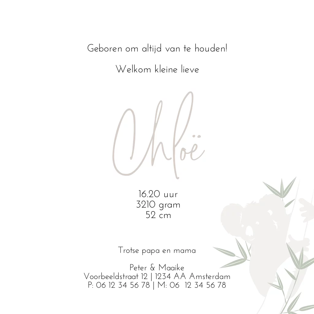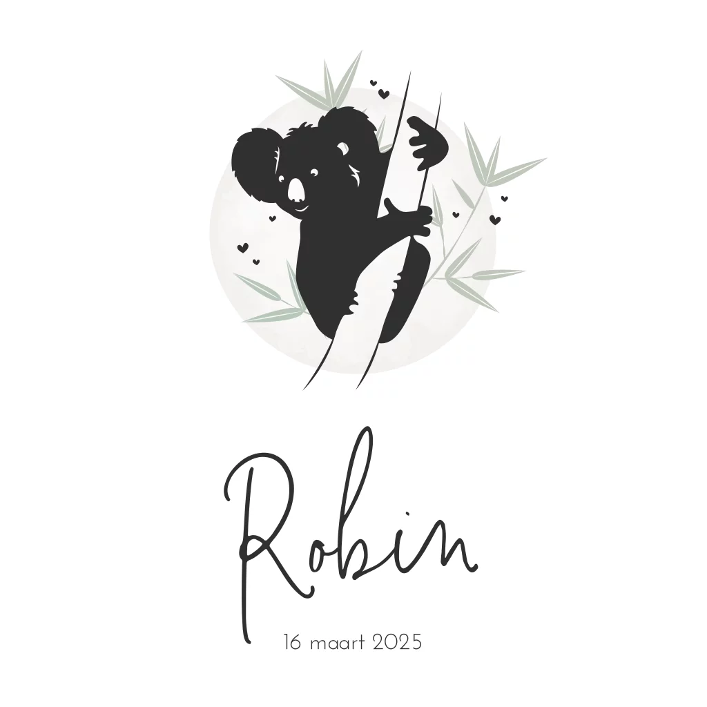 Op dit stoere geboortekaartje staat de illustratie van een koala die in een boom zit. Het zwart van de koala en het groen van de takjes komen goed naar voren tegen de witte achtergrond. Bestel snel een proefdruk om dit kaartje in het echt te zien!