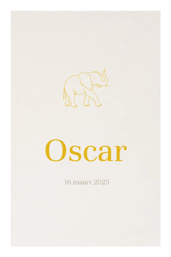 Op dit kaartje voor de geboorte van jullie zoontje staat de lijntekening van een olifantje. De goudkleurige typografie sluit prachtig aan bij de beige achtergrond met wit kader. Bestel snel een proefdruk om dit kaartje in het echt te bewonderen!