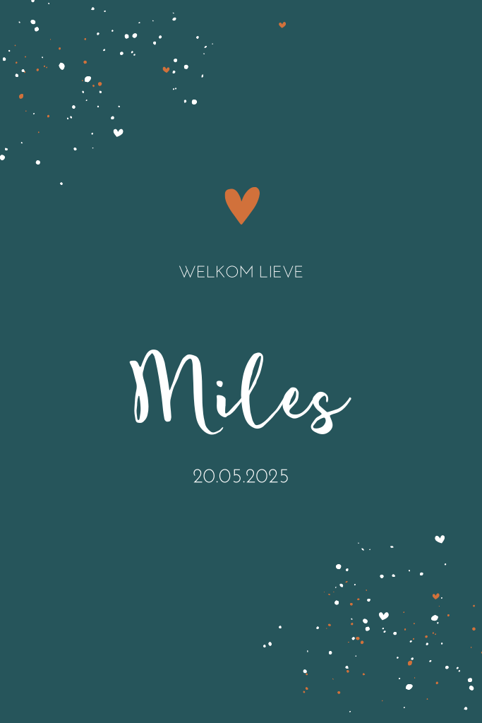 Op dit lieve kaartje voor de geboorte van jullie zoontje staat een koperkleurig hartje op een achtergrond in petrol. De verfspetters in wit en koperkleur geven een extra wauw-factor aan dit kaartje. Bestel snel een proefdruk om het kaartje in het echt te bewonderen!