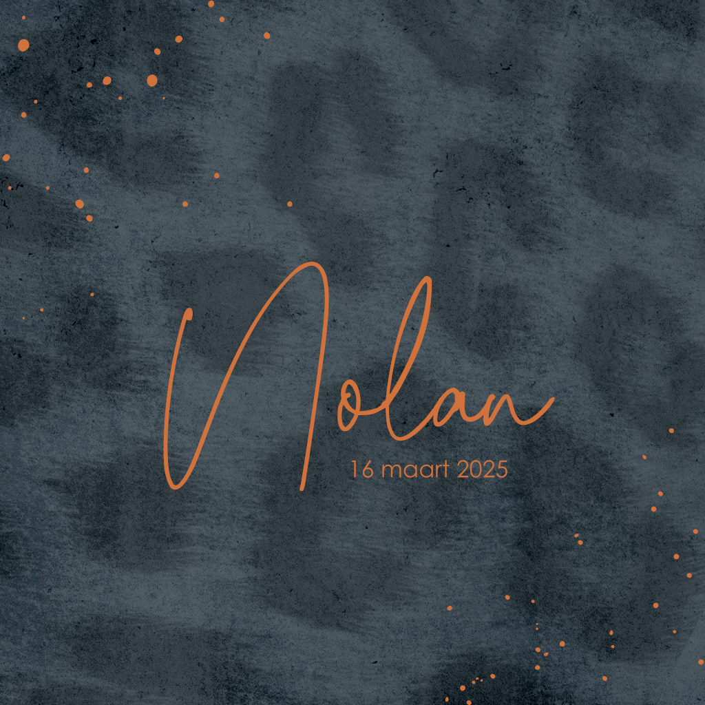 Dit is een stoer kaartje voor jullie pasgeboren zoontje. De typografie in koperkleur sluit mooi aan bij de donkere panterprint achtergrond. De verfspetters in koperkleur maken dit kaartje helemaal compleet. Bestel snel een proefdruk om dit kaartje in het echt te bewonderen!