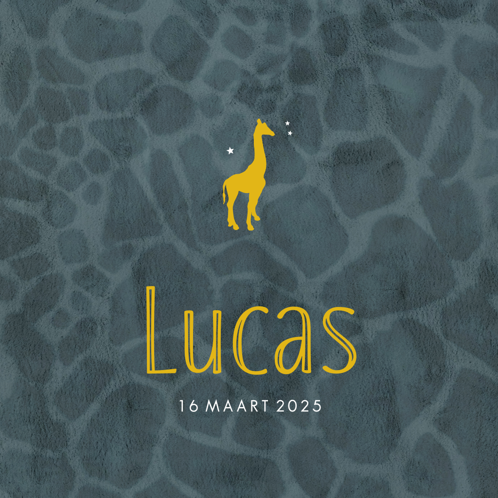 Op naar nieuwe avonturen! Op dit kaartje staat het silhouet van een giraffe met op de achtergrond een giraffe print. De goudkleurige accenten sluiten mooi aan bij de blauwe velvet-look achtergrond. Bestel snel een proefdruk om dit kaartje in het echt te bewonderen!