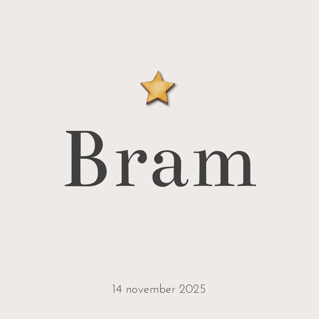 Op dit prachtige minimalistische kaartje voor de geboorte van jullie zoontje staat een ster. De naam en geboortedatum vallen door het donkere lettertype extra goed op tegen de lichte achtergrond. Bestel snel een proefdruk om dit kaartje in het echt te bewonderen!