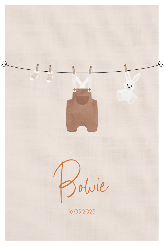 Schattig geboortekaartje met waslijn en kleertjes in aardetinten