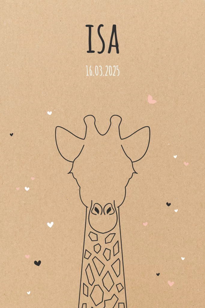 De illustratie van de giraffe staat centraal op dit geboortekaartje. De hartjes in het zwart, wit en roze komen mooi naar voren tegen de kraftlook achtergrond. Pas het kaartje naar wens aan in de online editor!