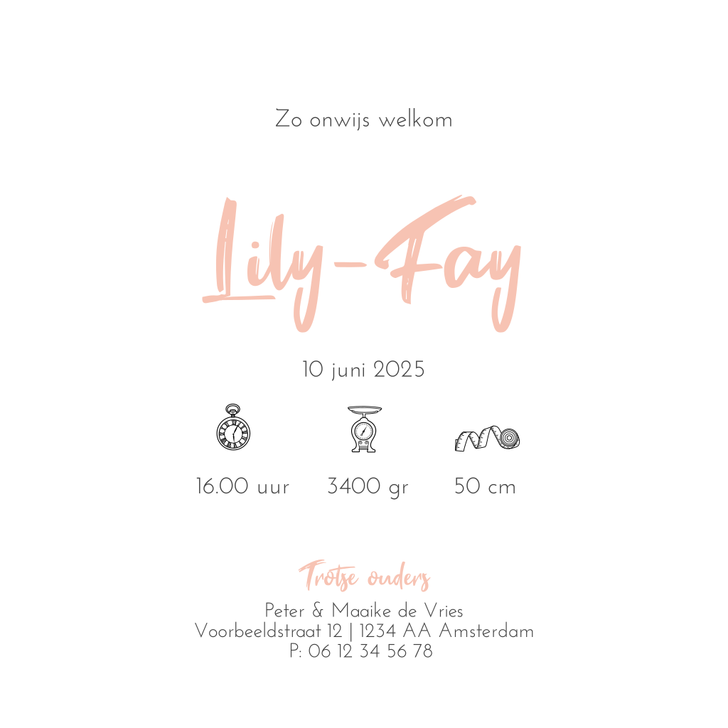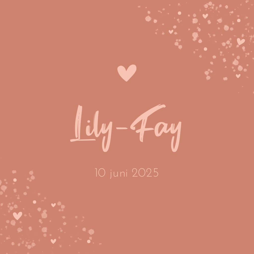 Dit is een lief kaartje voor jullie pasgeboren dochter. De terracotta achtergrond zorgt ervoor dat de licht roze typografie en verfspetters mooi naar voren komen. Bestel snel een proefdruk om dit kaartje in het echt te bewonderen.