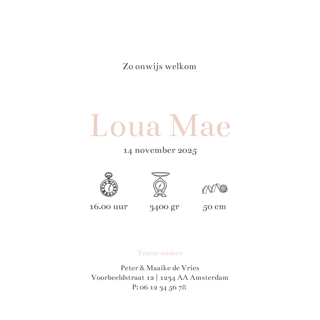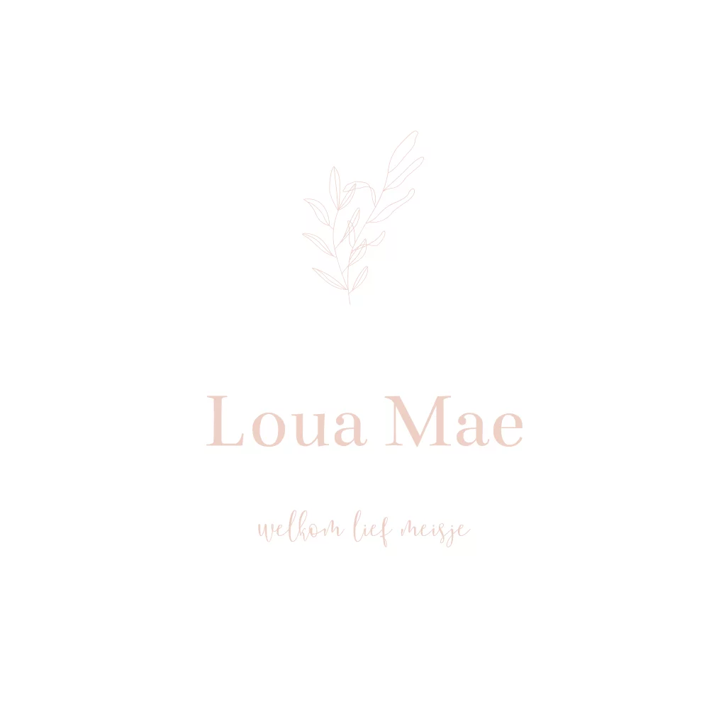 Dit is een minimalistisch kaartje voor de geboorte van jullie dochtertje. De roze lijntekening van een takje is erg subtiel en de licht roze typografie zorgt voor een zachte uitstraling. Pas het kaartje naar wens aan in de online editor.