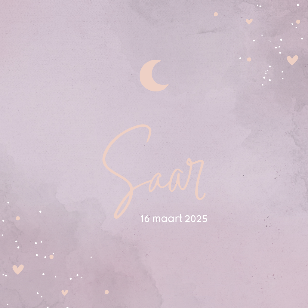 Lief lila babykaartje met maantje, hartjes en verfspetters