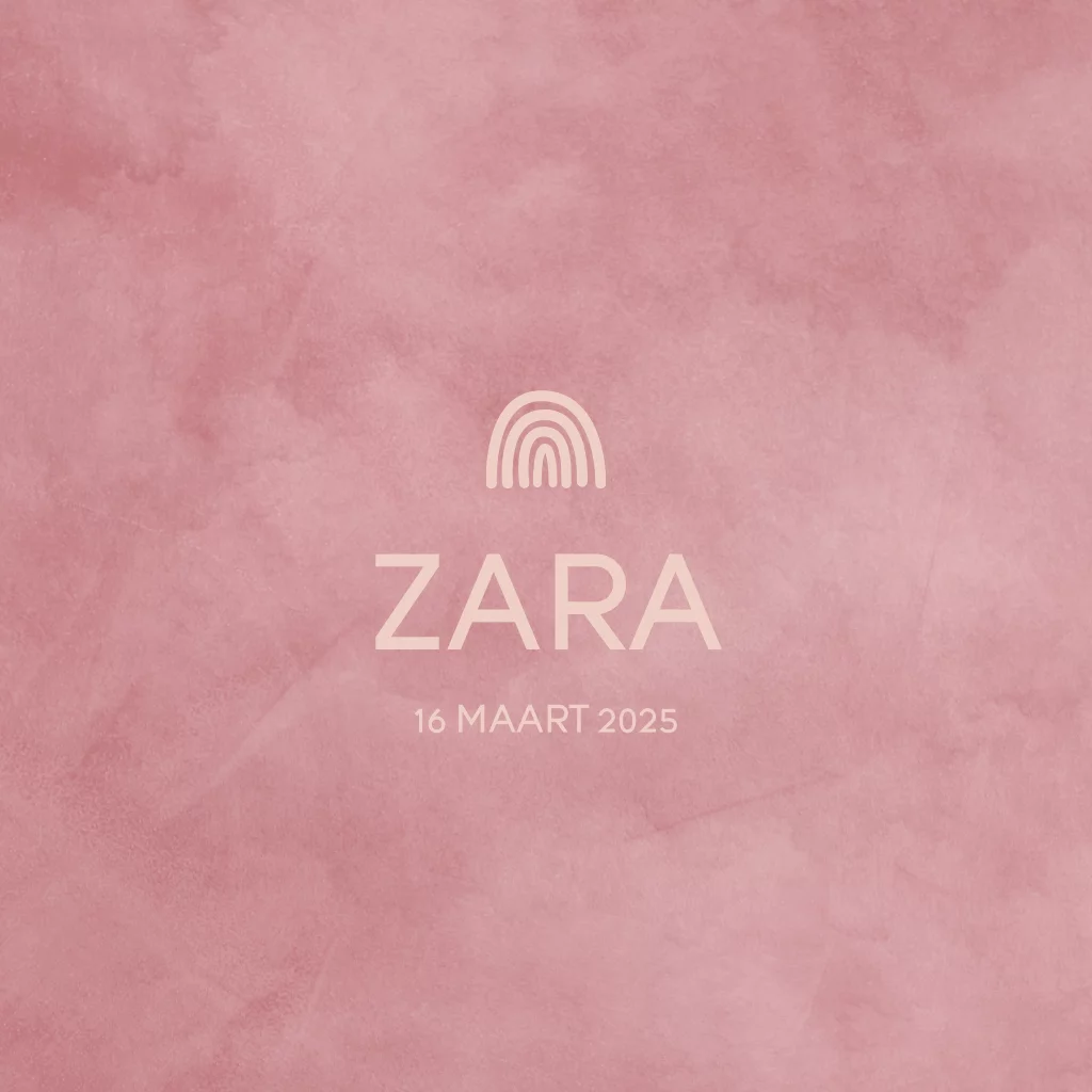 Dit is een lief babykaartje met regenboog voor de geboorte van jullie dochtertje. De roze velvet-look achtergrond past perfect bij dit schattige kaartje.