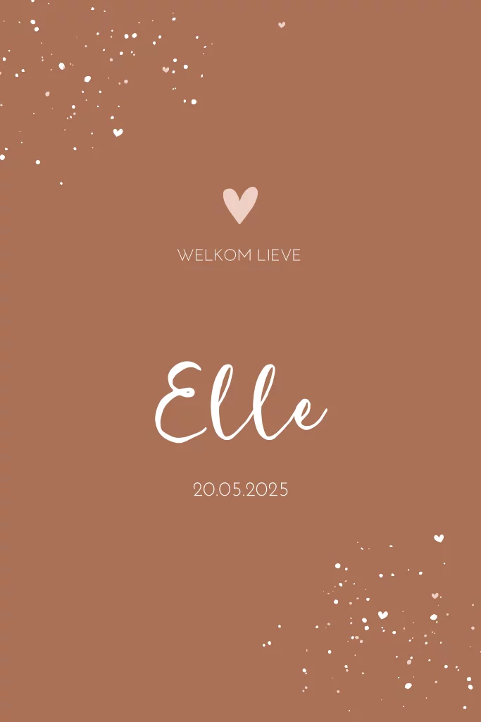 Dit is een lief kaartje voor de geboorte van jullie dochter. De typografie, het hartje en de verfspetters komen door de lichte kleur mooi uit tegen de roestbruine achtergrond. Pas het kaartje helemaal naar wens aan in de online editor.