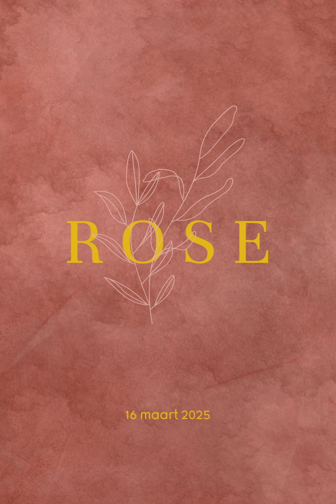 Sfeervol babykaartje met lijntekening van een takje en goudkleurige typografie op een terracotta velvet-look achtergrond. Bestel snel een proefdruk om dit prachtige kaartje in het echt te zien!