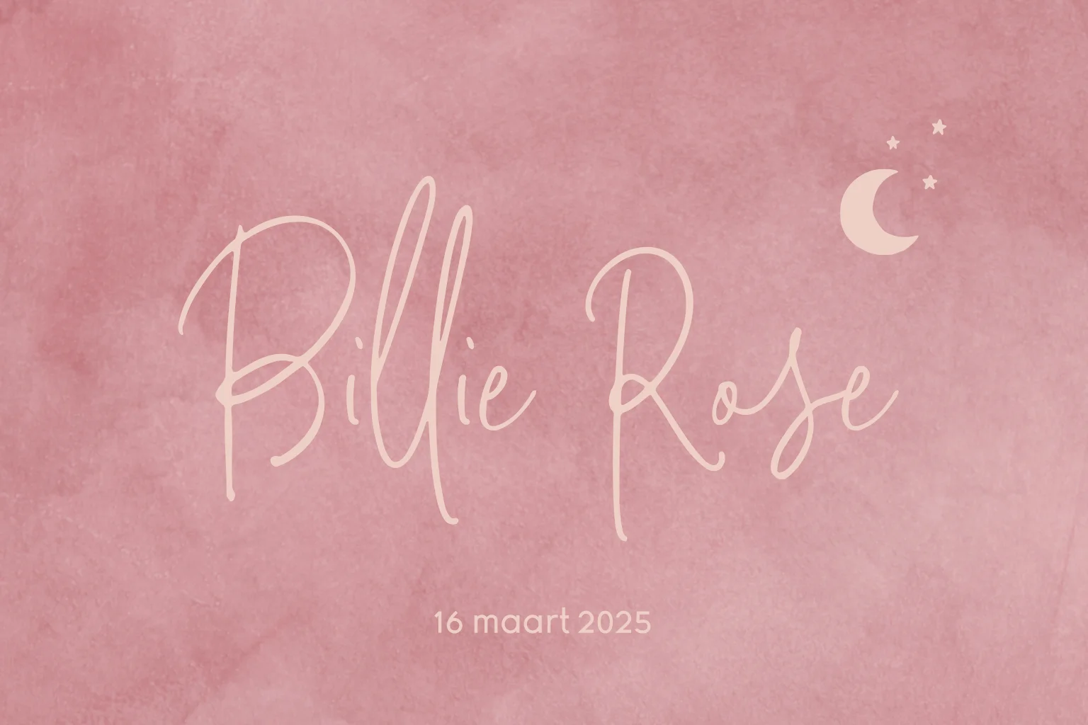 Schattig geboortekaartje met maan en drie sterretjes. De naam en geboortedatum komen prachtig uit tegen de roze velvet-look achtergrond. Bestel snel een proefdruk om dit kaartje in het echt te zien!