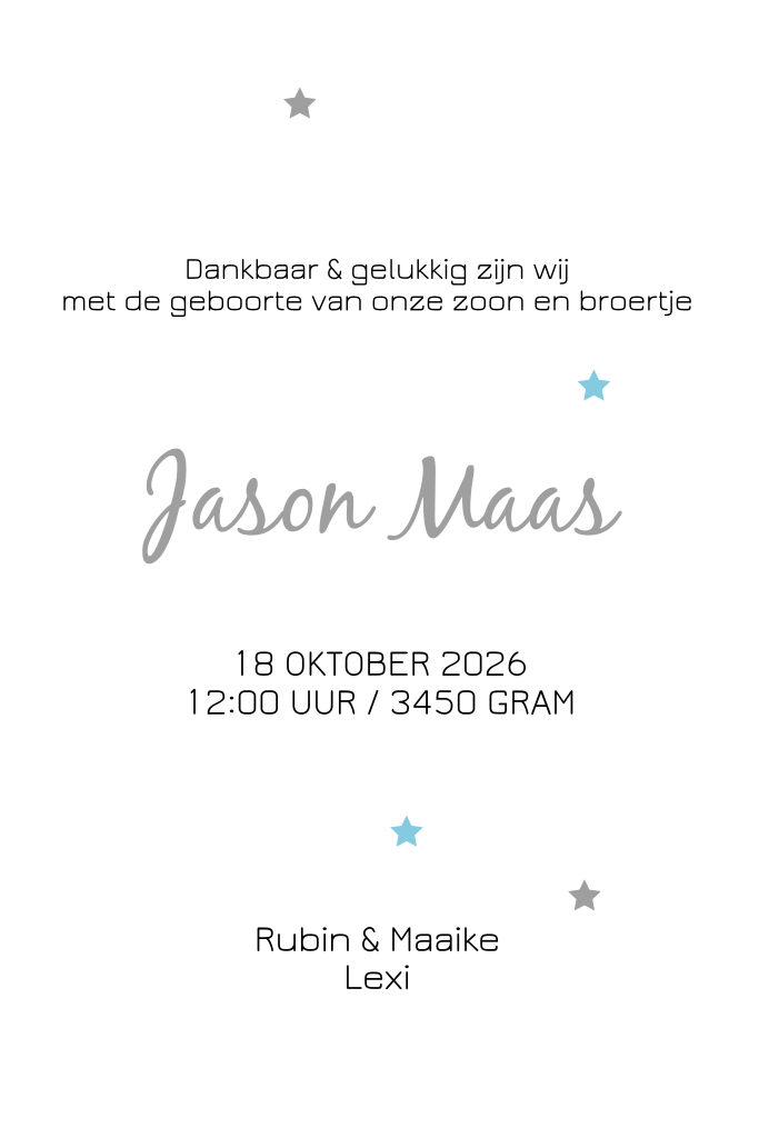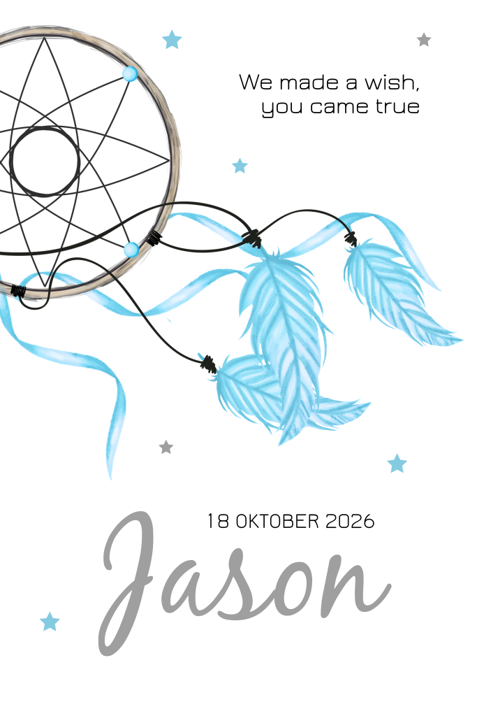 Origineel geboortekaartje met dromenvanger. De blauwe veertjes en sterretjes maken dit babykaartje juist zo leuk. Helemaal leuk voor jullie zoontje.