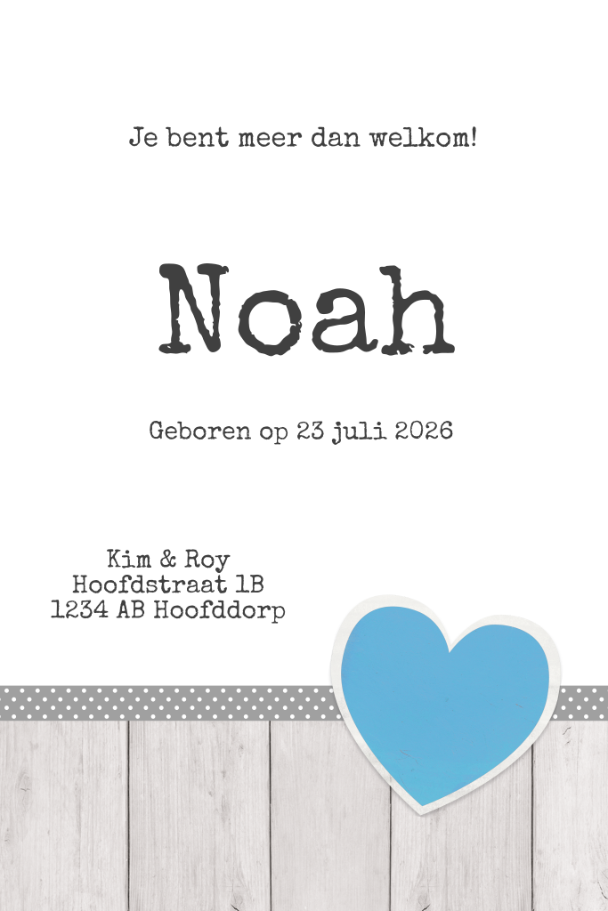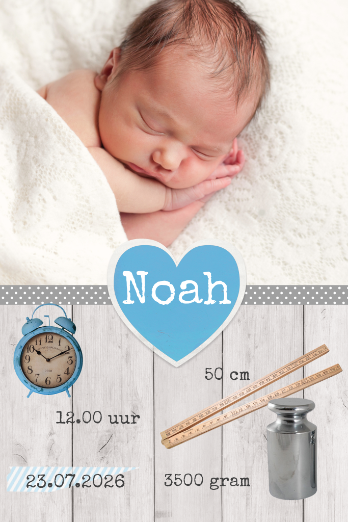 Gaaf geboortekaartje met leuke afbeeldingen van een gewichtje, vintage meetlat en klokje. Je kunt zelf de teksten aanpassen en straks de mooiste foto toevoegen van jullie zoontje. Zo maak je dit geboortekaartje gemakkelijk zelf.