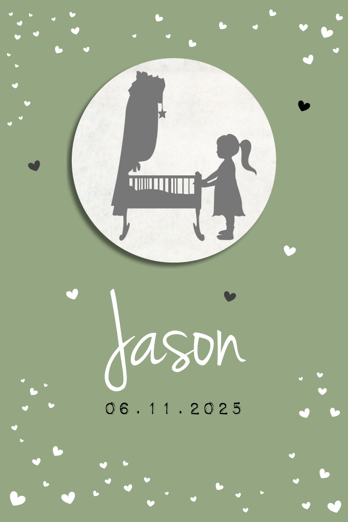 Hip en lief kaartje voor een pasgeboren jongen met een silhouet van een grote zus die aan de wieg van haar kleine baby broertje staat. Met mooie hartjes op een olijfgroene achtergrond.