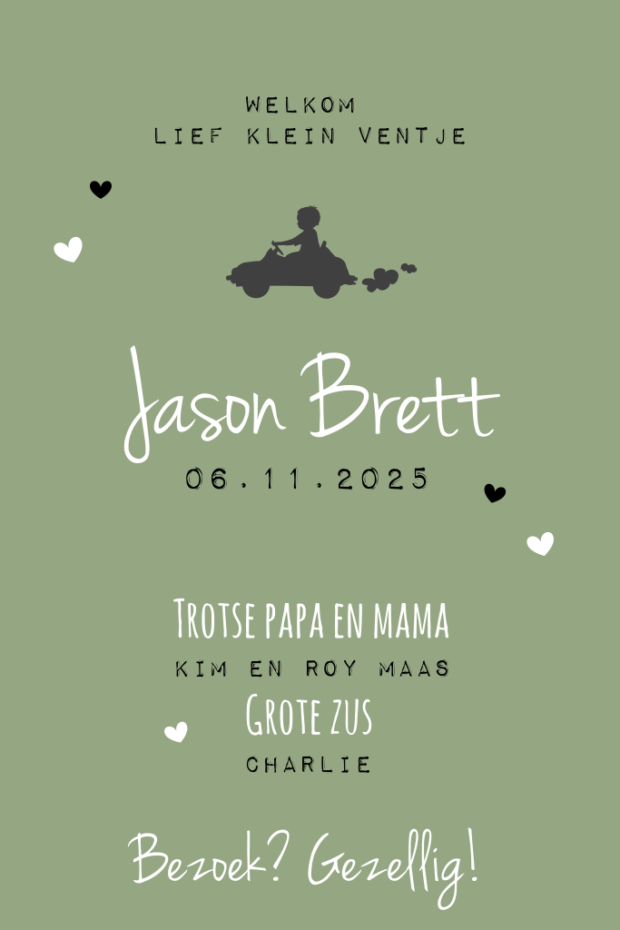 Olijfgroen geboortekaartje jongetje met een silhouet van zus bij wieg