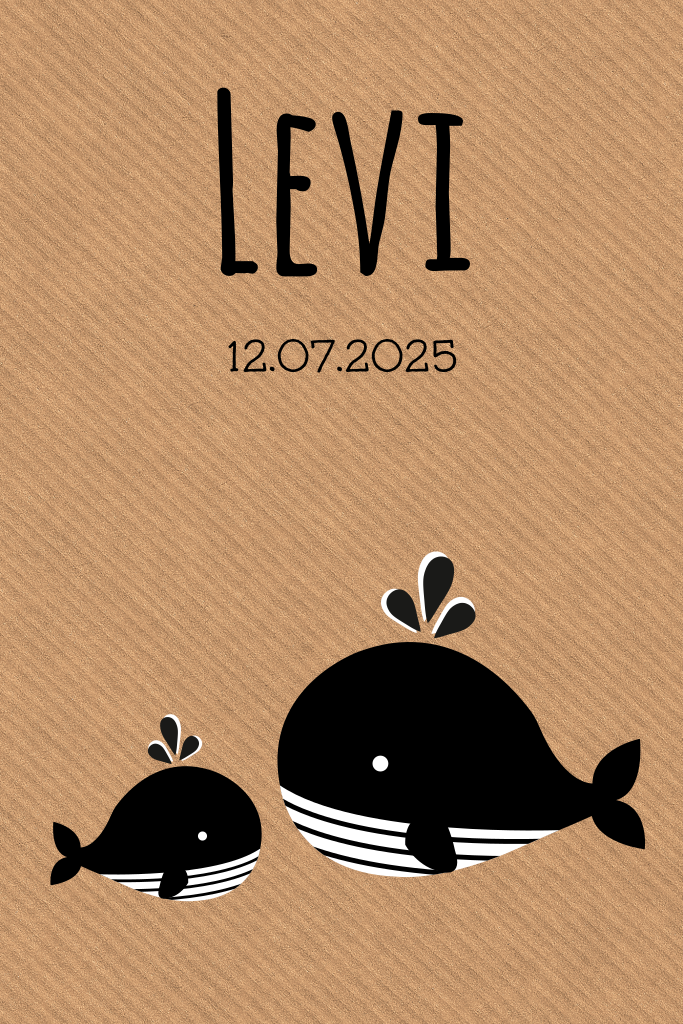 Schattig kaartje voor de geboorte van een jongen met een baby walvisje met zijn vader/moeder op een stoere kraft achtergrond. Pas de kleuren aan en verander te teksten en maak zo een unieke kaart!