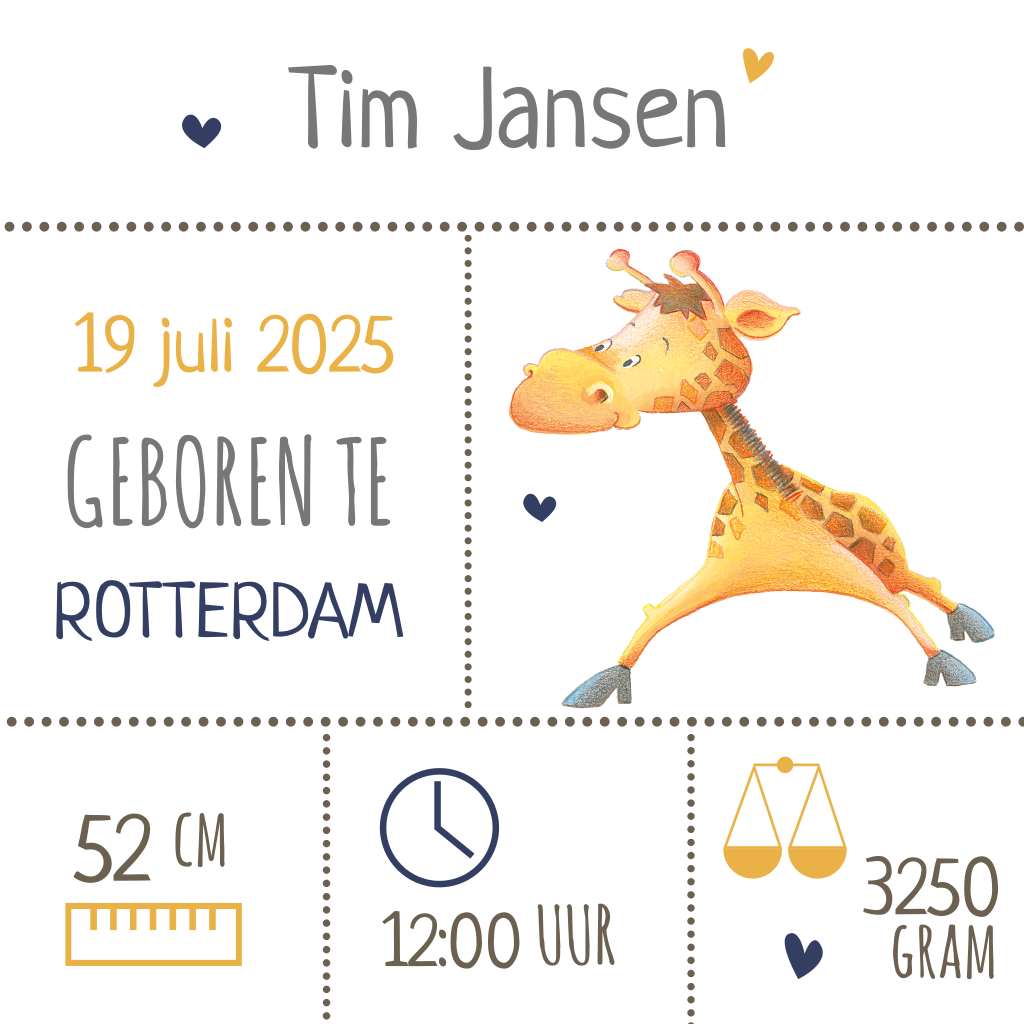 Schattig kaartje voor een pasgeboren jongetje met een illustratie van een schattige girafje. Verander de kleuren en teksten en maak je kaartje uniek.