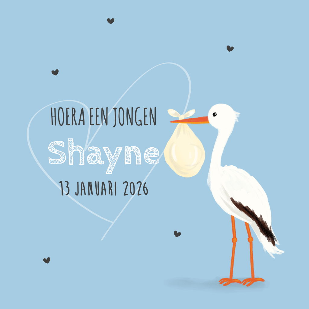 Geboortekaartjes met traditionele ooievaars blijven leuk! Wist je dat je dit kaartje elke kleur kan geven die je wilt? Klik op 'Achtergrond' en kies jouw favoriete kleur of patroon. Zo maak je dit geboortekaartje helemaal eigen. Aan de binnenkant van dit kaartje kun je een foto plaatsten van jullie zoontje en vind je nog zo'n schattige ooievaar met draagdoek.