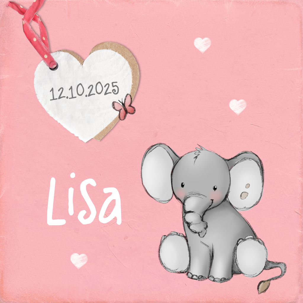 Lief geboortekaartje meisje met tekening olifantje en hartjes label