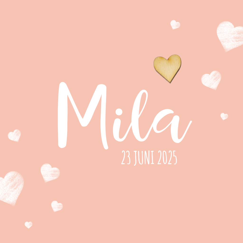 Uniek kaartje voor de geboorte van je dochter met perzik achtergrond met daarop witte geverfde hartjes en één echte houten hartje die je er zelf op kunt plakken.