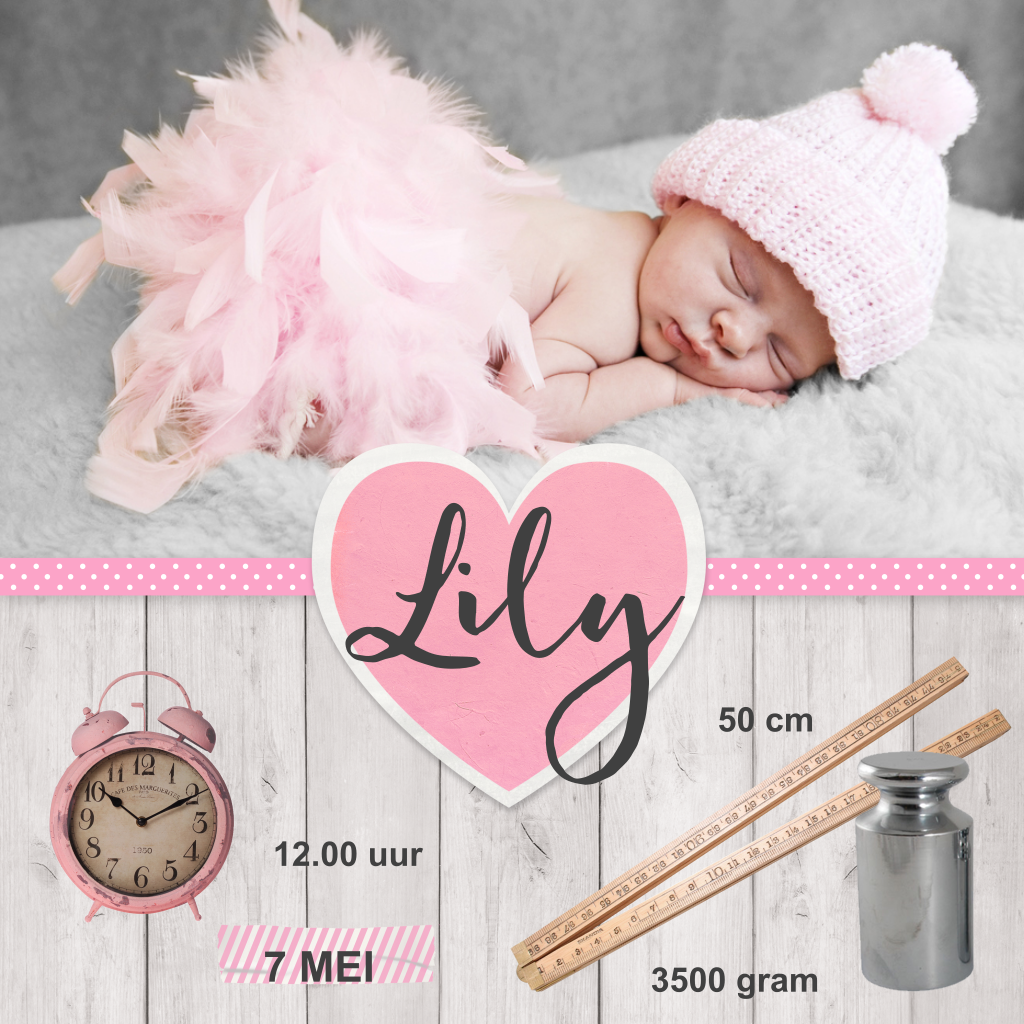 Schattige geboortekaart voor je dochtertje met houten achtergrond en ruimte voor een eigen foto. De foto's van een wekker, meetlat en gewicht zijn extra leuk om aan te geven wanneer je dochter geboren is en hoe groot ze was. Verander de kleuren en teksten en maak zo een uniek geboortekaartje.
