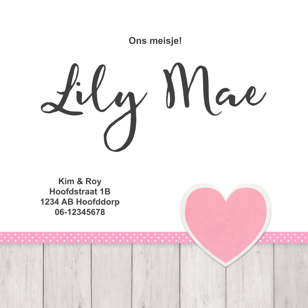 Lief geboortekaartje voor meisje met foto hout en roze hartje
