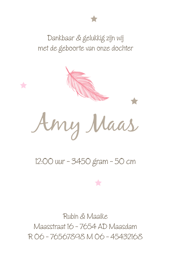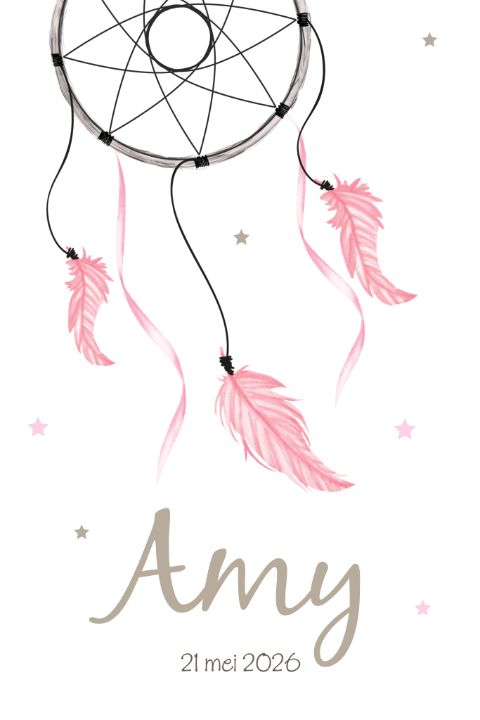 De boho look is helemaal in. Dit prachtige geboortekaartje met dromenvanger past daar perfect bij. Wat zijn die roze veren lief!