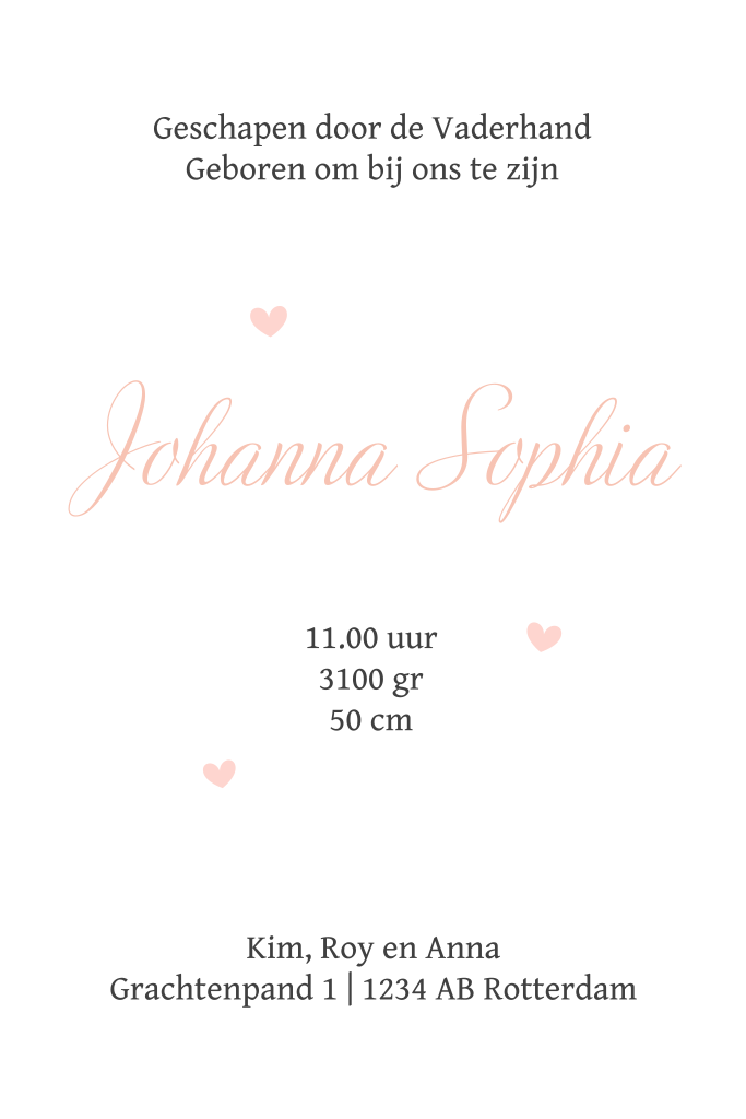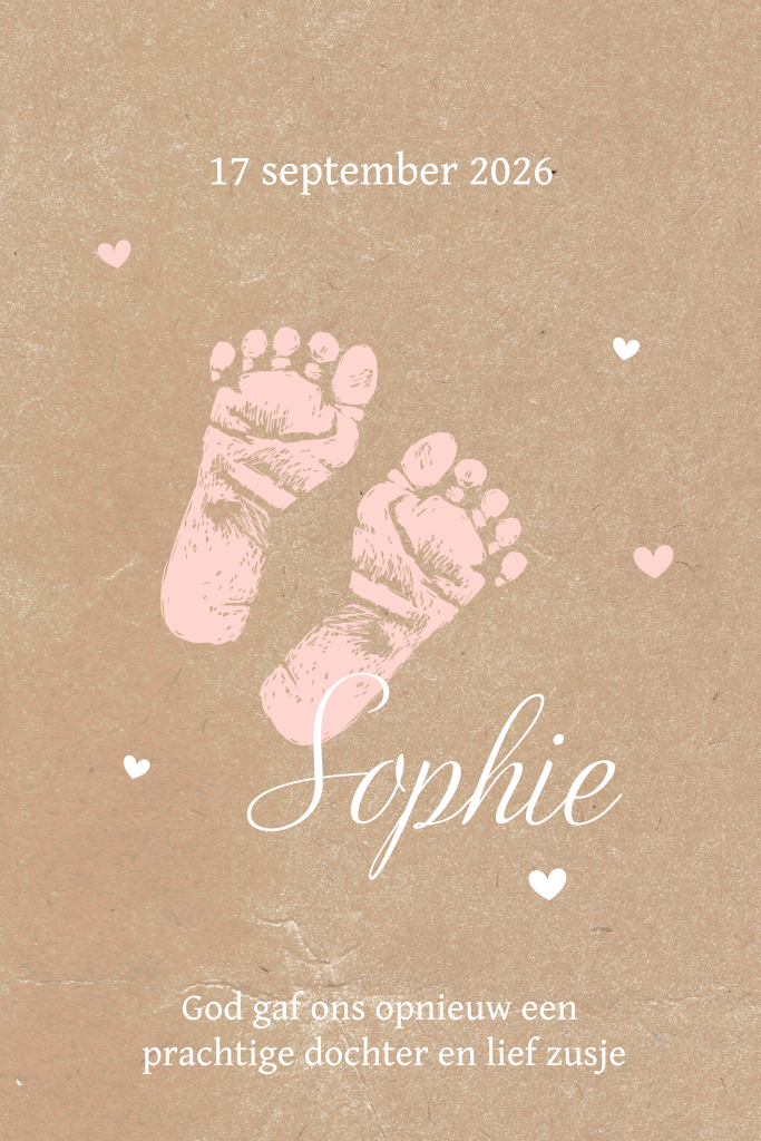 Hip geboortekaartje met kraft en lieve baby voetjes. Met mooie christelijke teksten. Jullie kiezen zelf gemakkelijk de kleuren van de voetjes, hartjes en teksten.