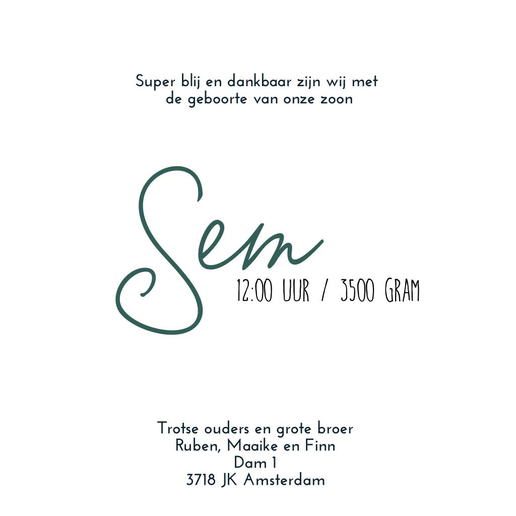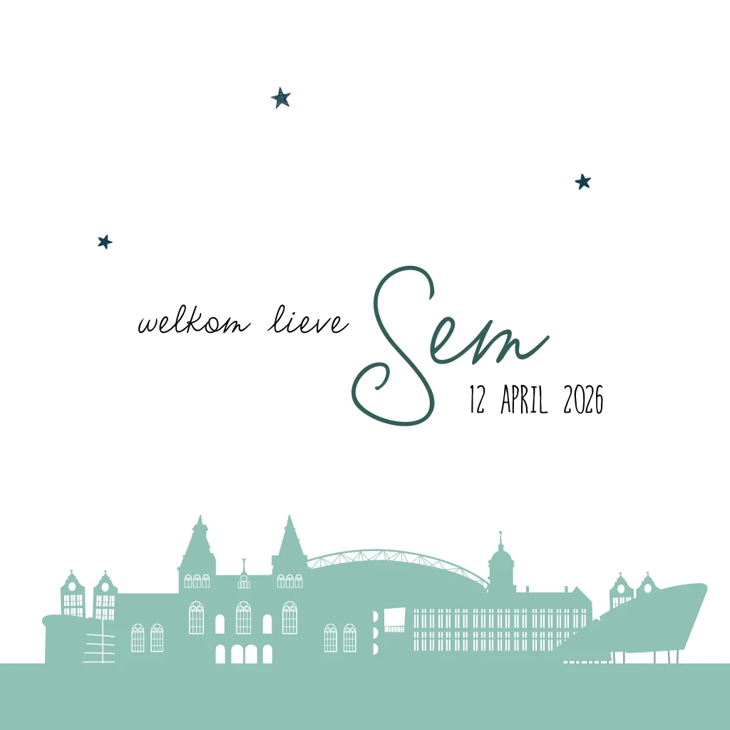 Stoer geboortekaartje voor een jongen met allerlei beroemde gebouwen uit de hoofdstad.