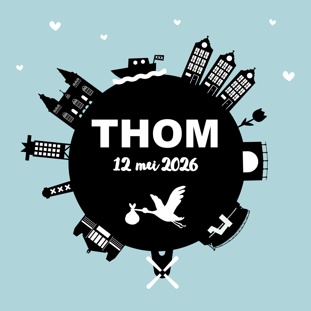 Origineel Amsterdams geboortekaartje met alle hoogtepunten uit de stad - grachtenpandjes, Amsterdammertjes en het Rijks. De achtergrondkleur is eenvoudig zelf aan te passen.