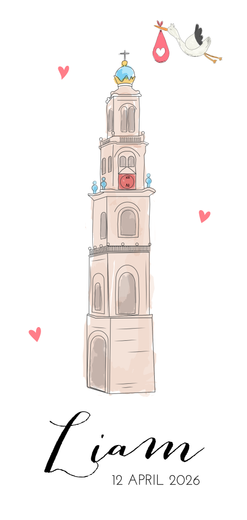 Origineel Amsterdams geboortekaartje met de Westertoren, voor een jongen of een meisje. De kleuren van de hartjes zijn eenvoudig aan te passen. Dit kaartje werd exclusief voor Hippe-Geboortekaartjes ontworpen.