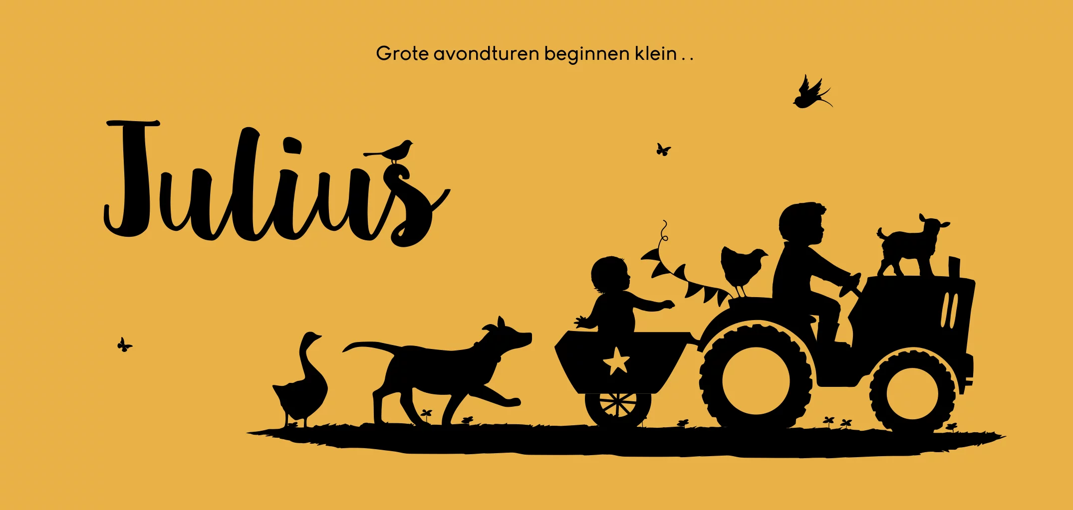 Kijk, daar rijden twee jongens op de trekker met allemaal boerderijdieren om hen heen! Deze panorama-kaart in de hippe kleur okergeel is leuk voor een jongen! Grote avonturen beginnen klein..