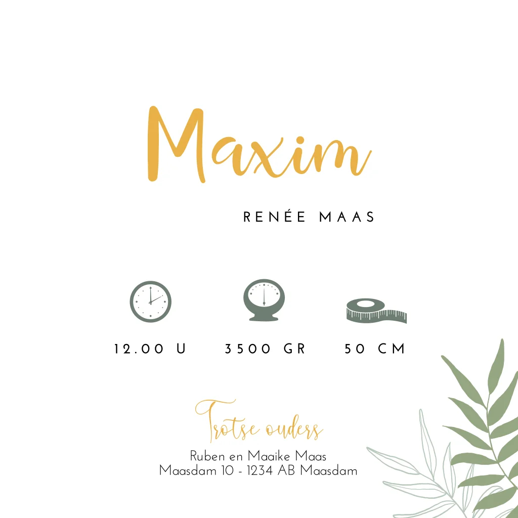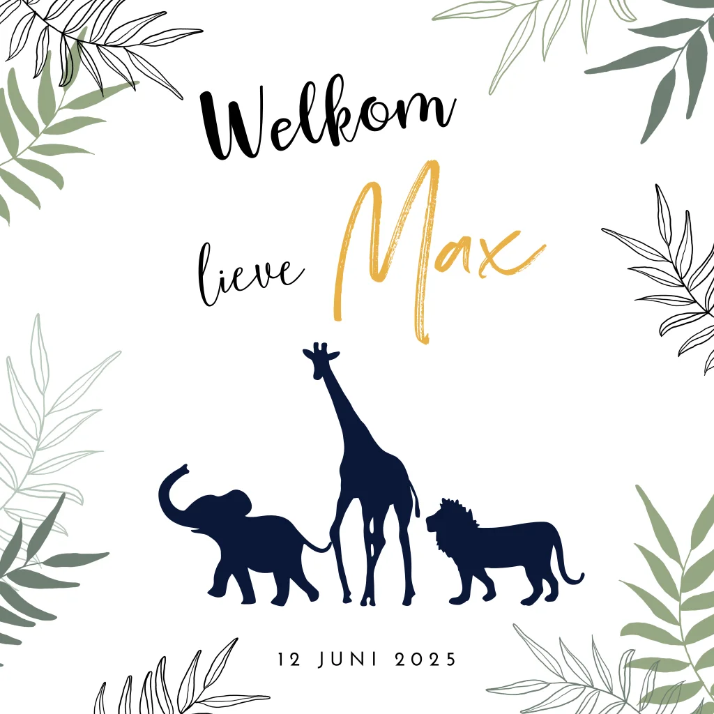 Welkom lieve X! Hoe heet jouw kindje? Zet zijn of haar naam op deze stoere geboortekaart in junglethema met een silhouet van een olifant, giraffe en leeuw. De blaadjes maken hem helemaal compleet!