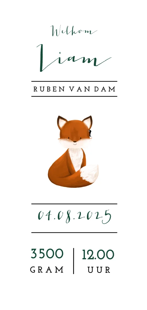 Een leuk geboortekaartje voor een jongen! Het schattige vosje staat op de voor- en achterkant van de kaart en springt er mooi uit op deze witte achtergrond. Je kunt eventueel de kaart nog aanpassen in de online-editor door bijvoorbeeld andere lettertypes te gebruiken. Zo wordt het helemaal jouw kaartje!