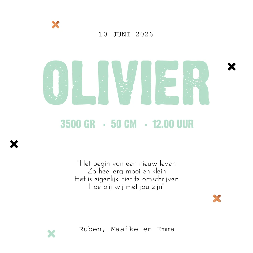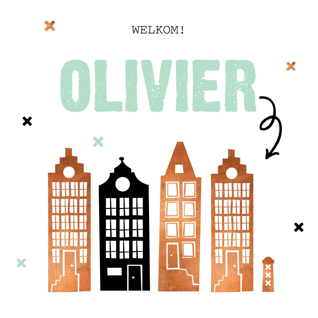 Hip geboortekaartje met grachtenpandjes in bronskleur, superleuk voor Amsterdammers, maar ook eenvoudig tot een algemeen geboortekaartje te maken door het paaltje weg te halen. Dit geboortekaartje is zowel voor jongens als meisjes.
