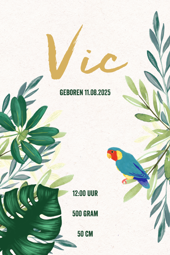 Stoer botanisch geboortekaartje voor een jongen met groene bladeren en een getekende papegaai op kraft.